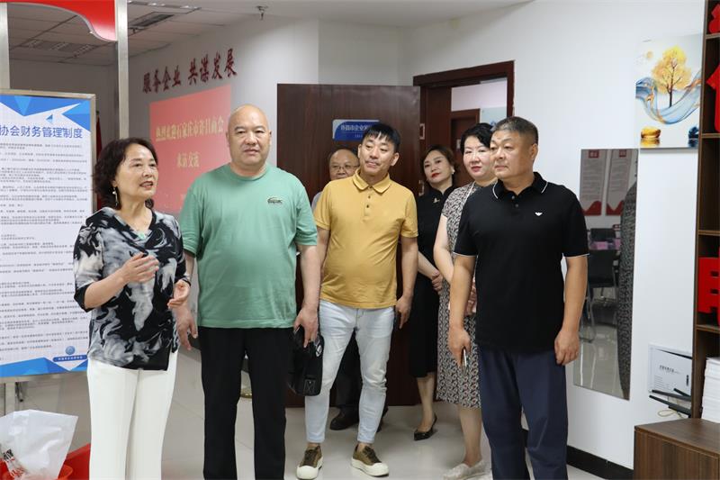 6月21日上午石家莊市許昌商會會長朱登山、 執(zhí)行會長孫會營、賈克輝、秘書長焦平、副秘書長王建民一行5人蒞臨我會參觀交流。市工商聯(lián)副主席曲釗霞對到訪的兄弟商會表示熱烈歡迎,我會秘書長黃玉霞、執(zhí)行會長張建濤、副秘書長范文彥熱情接待并進(jìn)行座談交流。 通過參觀文化墻、觀看宣傳片向來賓展示了協(xié)會歷程和發(fā)展情況。